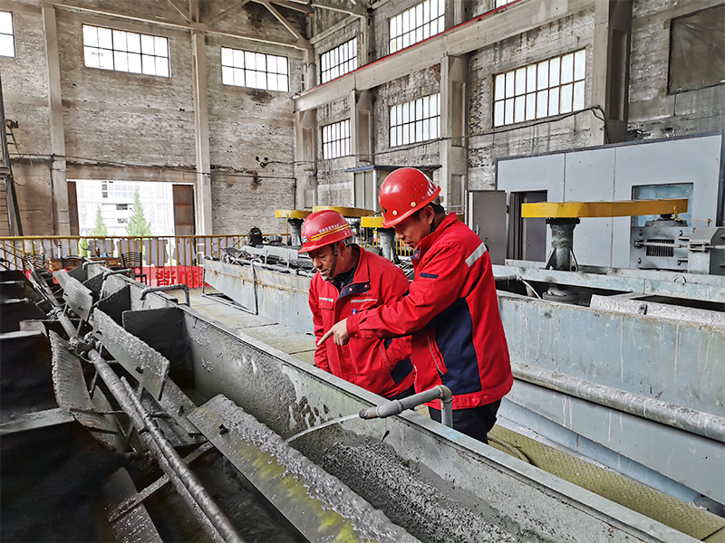 紧挨尾矿充填项目工地的就是公司的核心部门之一选厂。矿山企业如何将一块块矿石变成金灿灿的金精粉就得经过它的巧手。球磨机的轰隆声中,浮选槽里的刮板在不停的翻转。国庆假期里,选厂负责人濮国荣和各岗位的一线工作人员都在岗位坚守。