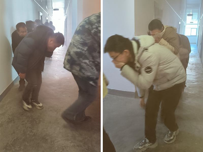 理论宣讲结束后,在宿舍楼模拟因电气线路故障引发火灾的场景,浓烟通过楼道扩散,迅速蔓延。宿舍职工按照应急预案,用手或湿毛巾捂住鼻口,低姿弯腰右行,沿制定的疏散线路有序撤离。