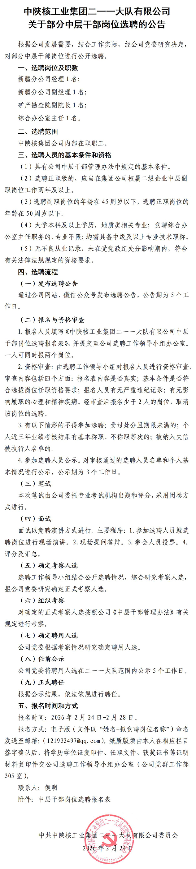 关于部分中层干部岗位选聘的公告